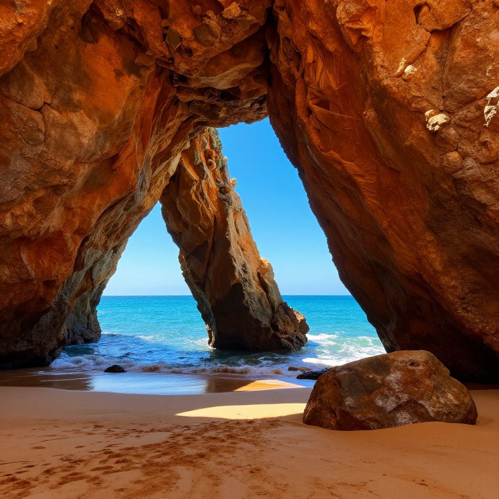 Photograph of a natural sea cave with orange-brown rocky walls, blue ocean, and sandy beach, framed by two large, jagged archways