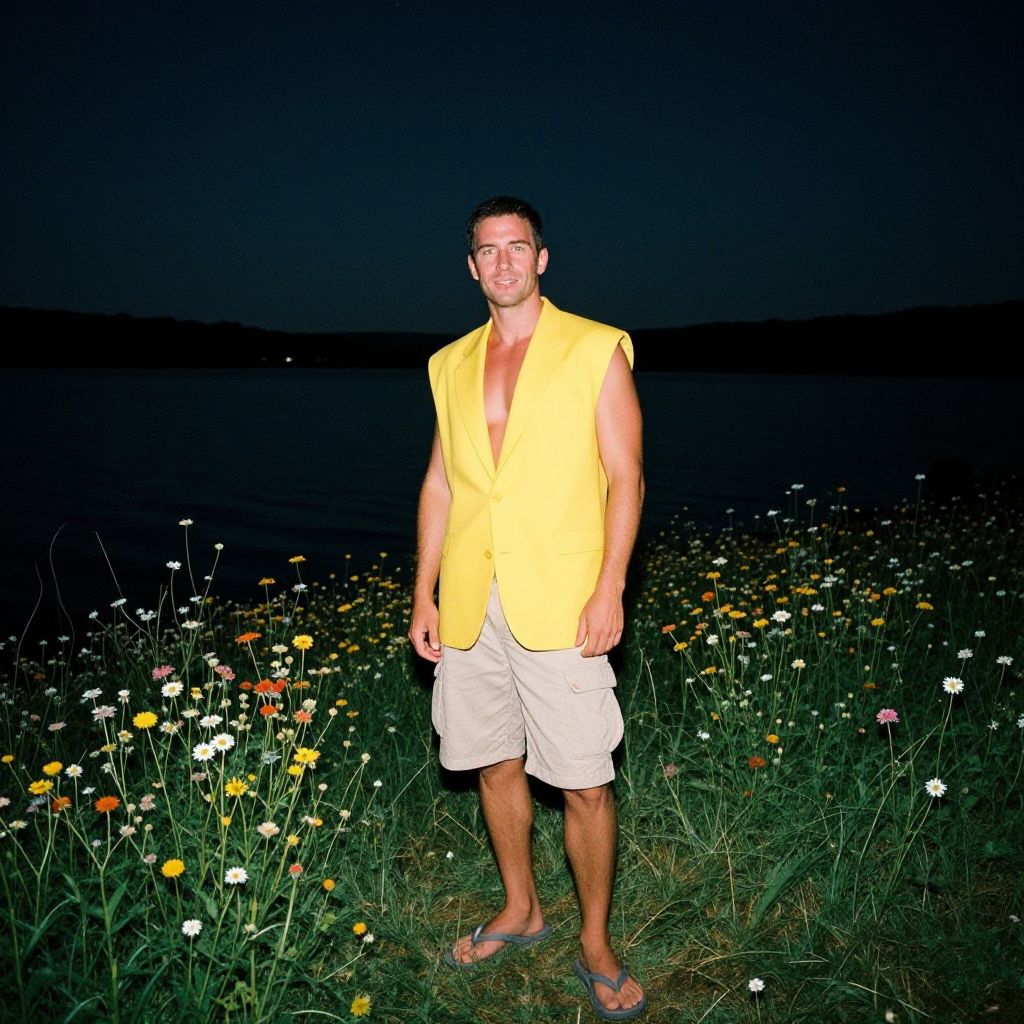 A man, bright yellow sleeveless beach blazer, beige cargo shorts, gray flip-flops, secluded lakeside, vibrant wildflowers, starry night sky, kodak sp analog photo, relaxed smile, carefree vibe Man has masculine face and piercing eyes