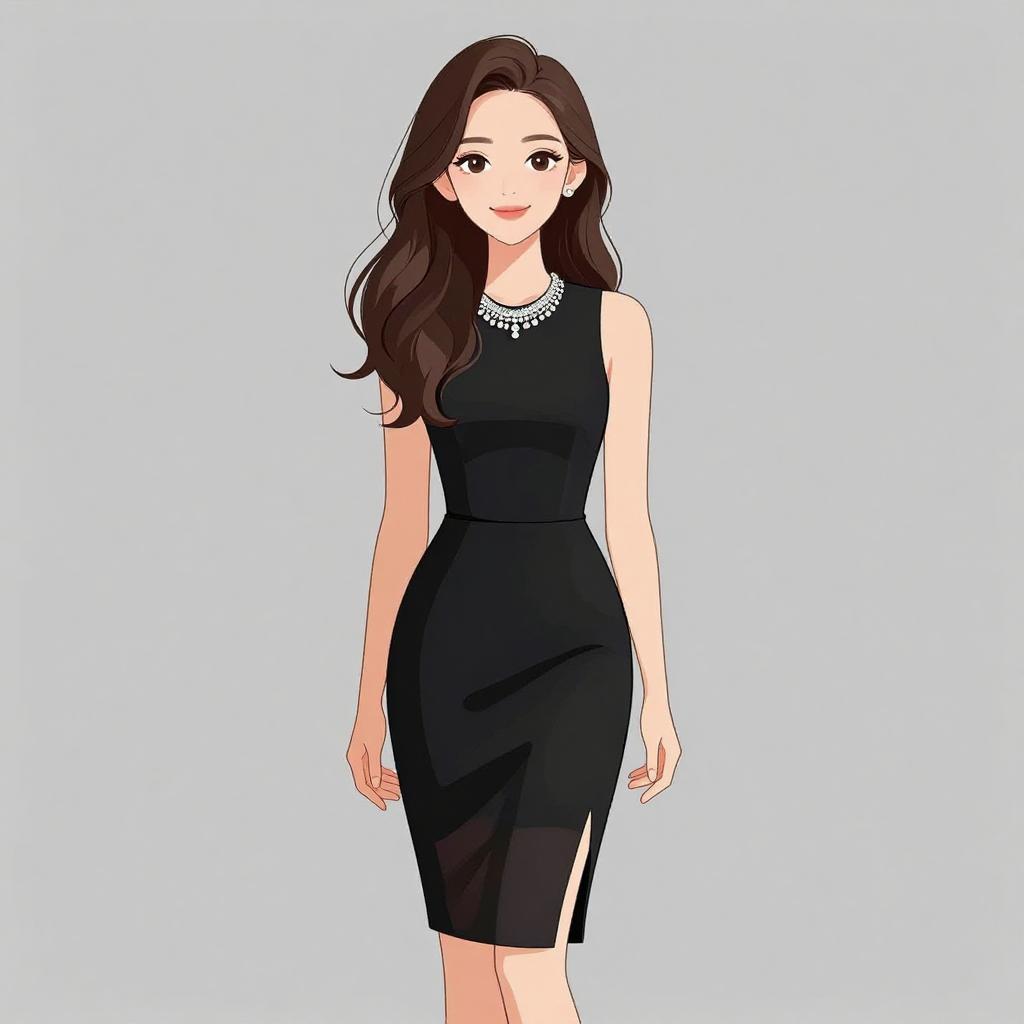 Digital drawing of a smiling woman with short brown hair, wearing a black, long-sleeve, form-fitting dress, holding a gold clutch,