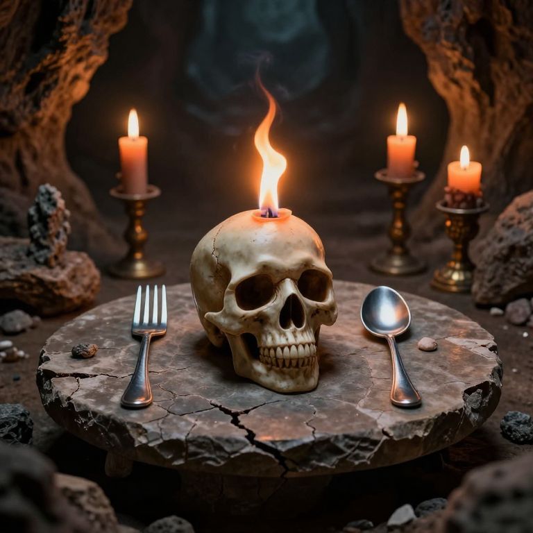 In the heart of a dark, cavernous landscape, a surreal dining scene unfolds. A skull-shaped candle holder, adorned with flowing flames, stands as the centerpiece on a round, cracked stone table. To its left, a fork and knife are neatly placed, their metallic surfaces gleaming under the dim light. On the right, a spoon rests, its handle pointing upwards. Surrounding the skull are various rock formations and small, cracked stones, adding to the eerie ambiance. In the background, three candles in ornate holders cast an orange glow, enhancing the otherworldly atmosphere. The overall composition is a striking juxtaposition of the macabre and the mundane, creating a unique and unsettling dining experience.