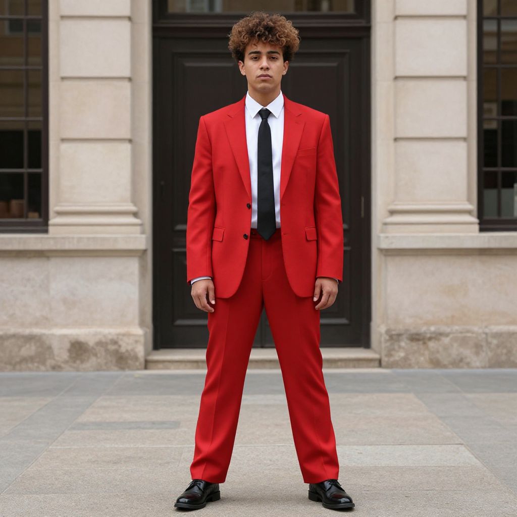 Photograph of a young man with curly brown hair standing in front of a large, black double door framed by beige stone columns. He is wearing a striking, bright red suit with a white dress shirt and a black tie. His black dress shoes are polished. The background includes a grey stone pavement and large, rectangular windows. The young man's expression is serious and he stands with his hands by his sides. The image has a sharp, vibrant color palette and a formal, urban setting.
