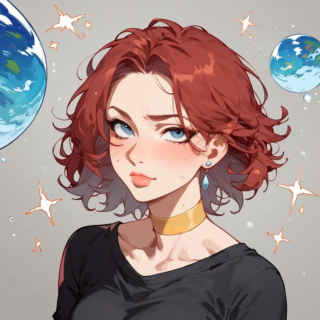 Score_9, score_8_up, score_7_up, source_questionable, blush, Akira, red hair, yellow choker, 1girl, standing on an planet, upper body shot, in a marine outfit, large comet, rising moons in the background, eyes turned to viewer