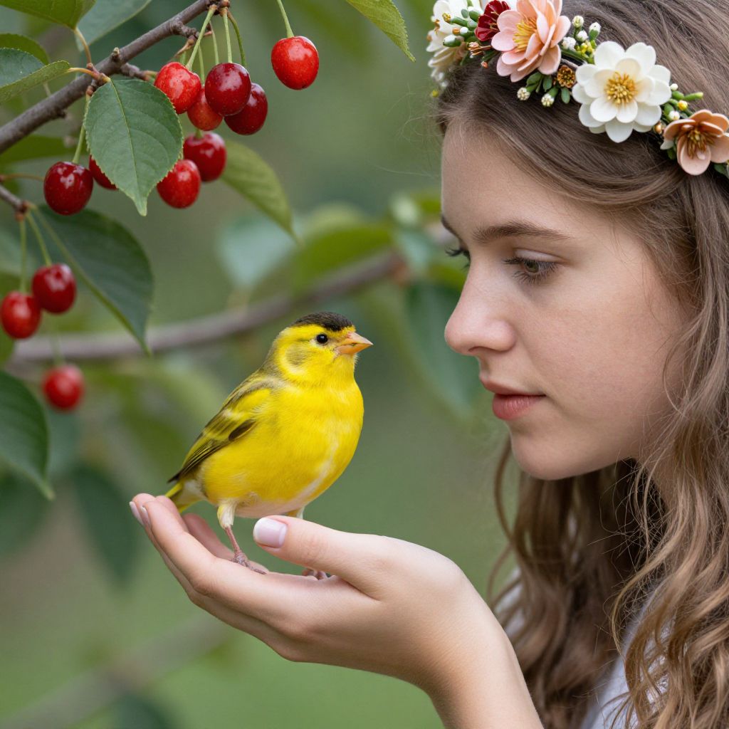 Young woman adorned with a floral headpiece gently holds a vibrant yellow finch perched delicately on her hand, surrounded by lush green branches bearing clusters of ripe red cherries.