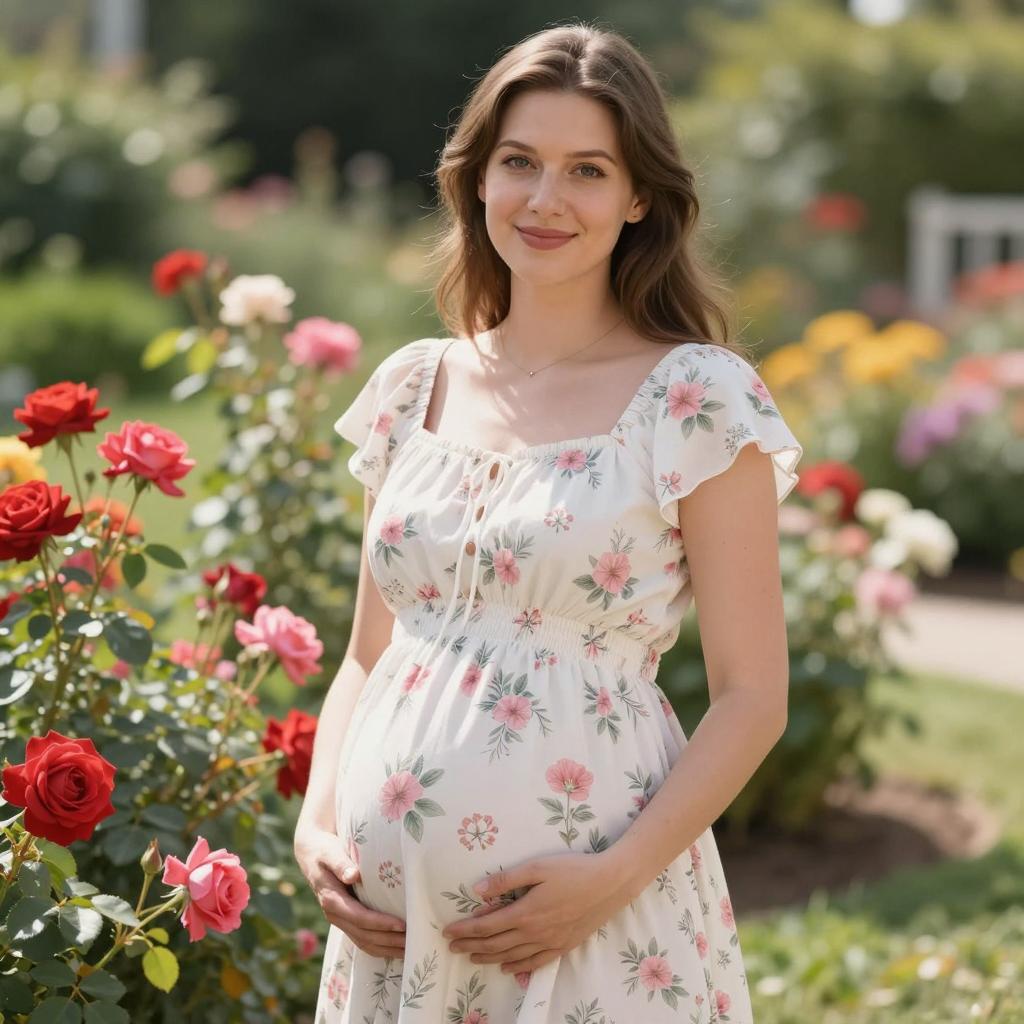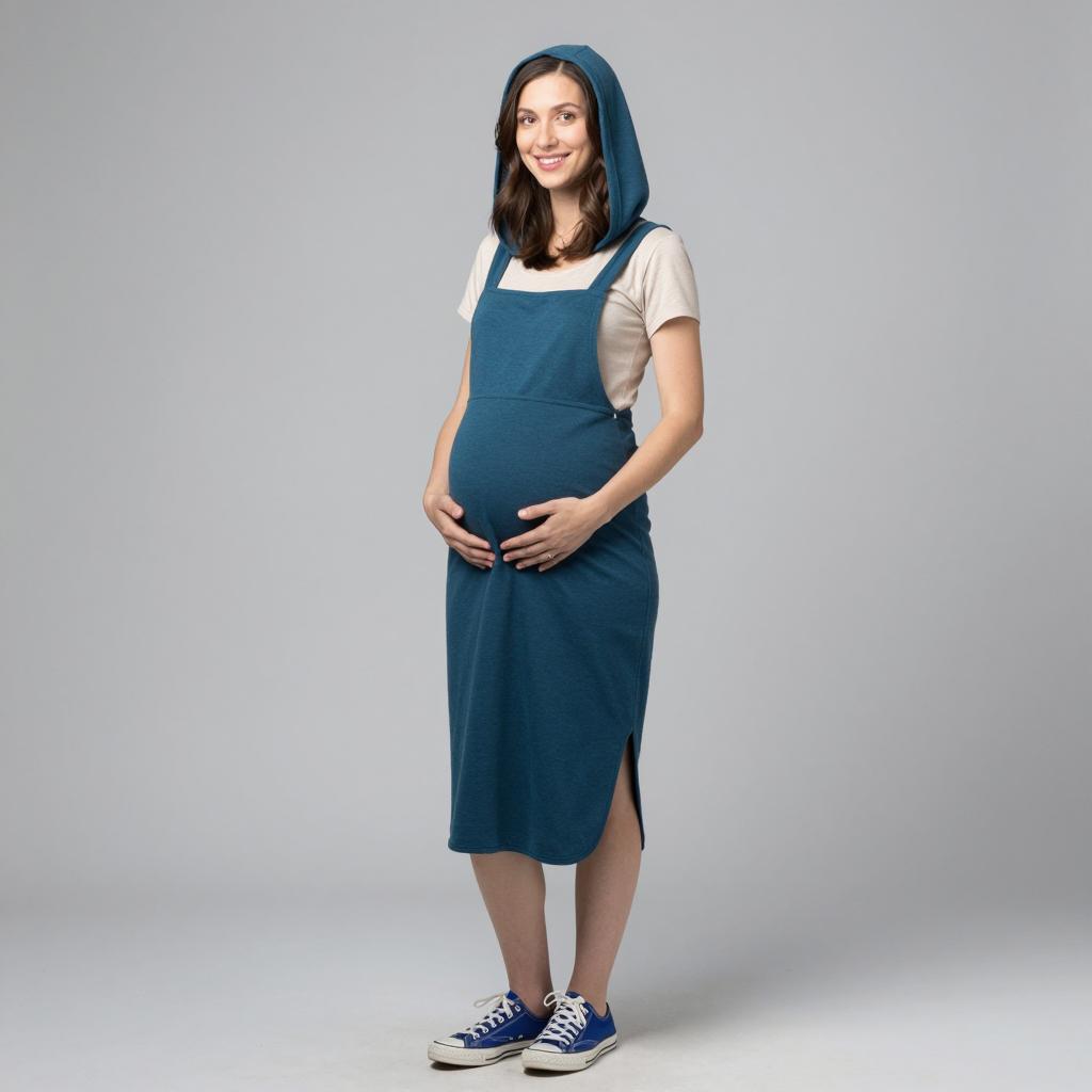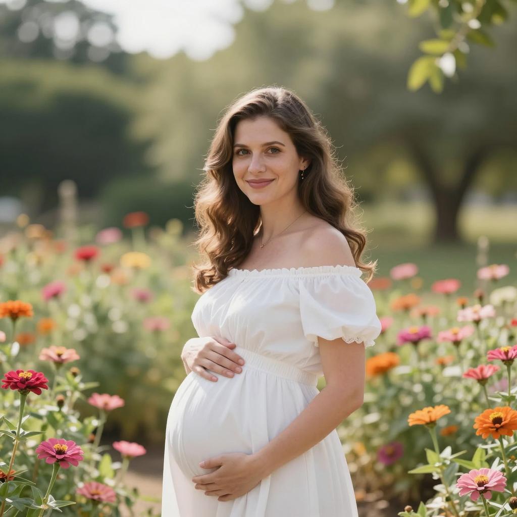 Portrait of a pregnant woman with fair skin and long blonde wavy hair wearing a black sleeveless dress and a wide-brimmed black witch hat with a white feather. She stands against a plain white background, gently cradling her baby bump with both hands, showcasing a serene and confident expression. The image is lit with natural light, highlighting a casual yet elegant boho-chic style.