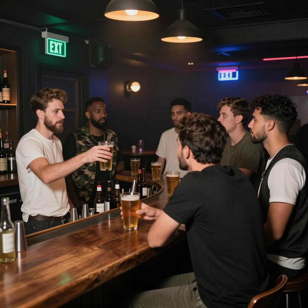 Nightclub bar scene. Six men stand around a dark wooden bar counter. Barman in white shirt serves beer. One man in camouflage vest talks to barman. Other men in casual clothing, some facing away. Drinks and bottles on counter. Background has dim lighting, tables, and a neon exit sign. Smoky atmosphere.