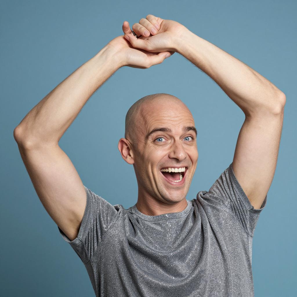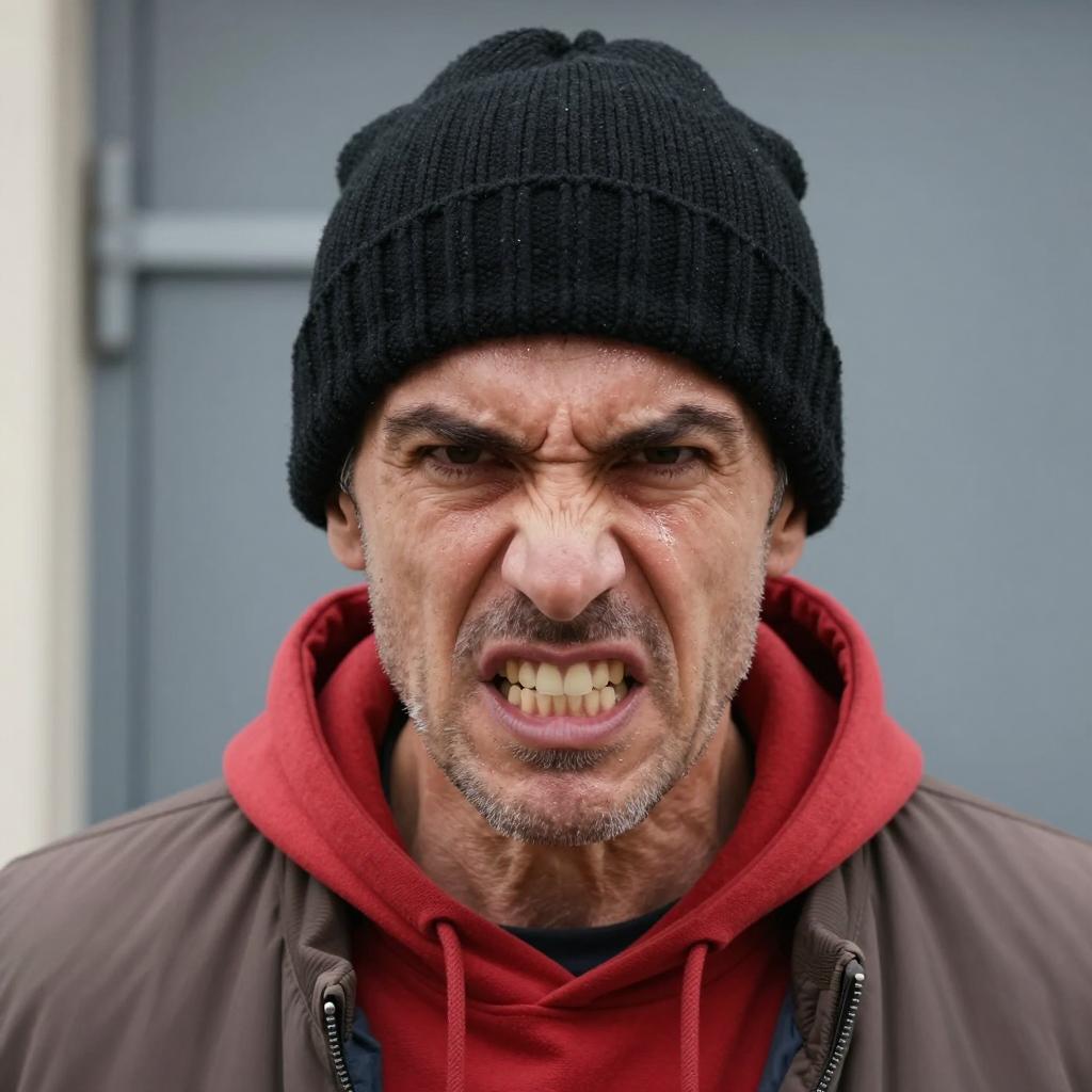 Photograph of a man with light skin, wearing a black hat, gray sweater, and black necklace, arms crossed. Blue radiating background with dark blue triangular beams. Man has neutral expression, slightly parted lips, and short dark hair.