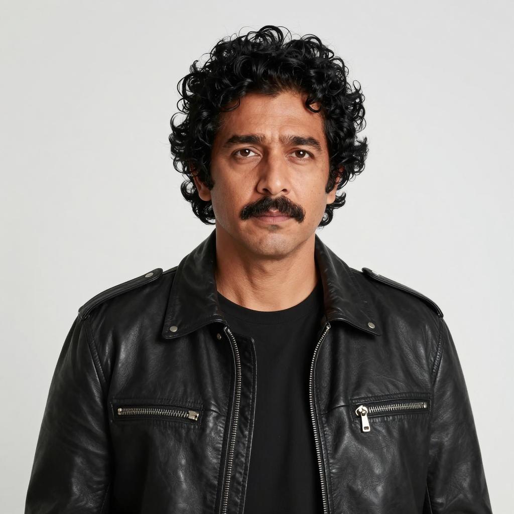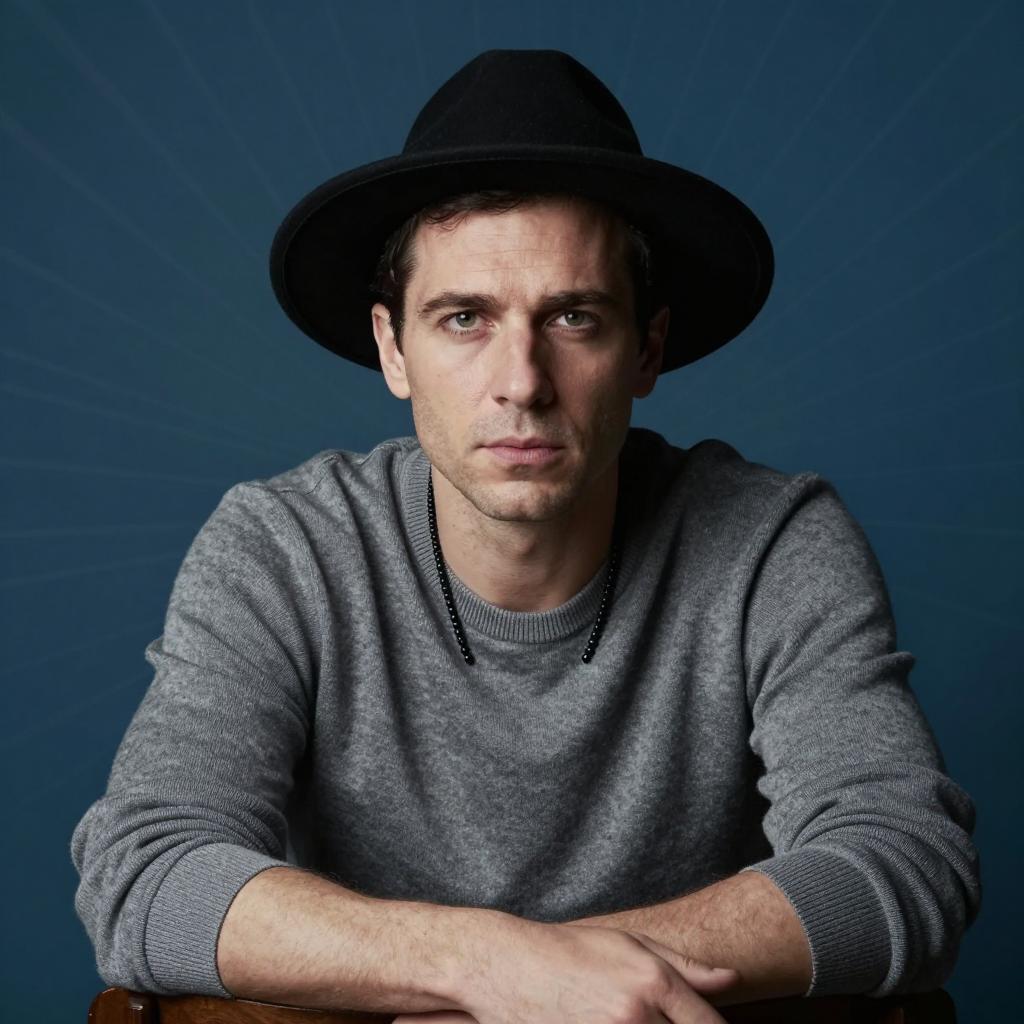 Portrait of a man with light skin wearing a black wide-brimmed hat, a gray sweater, and a black necklace. He has short dark hair, a neutral expression with slightly parted lips, and his arms are crossed. The background is a blue radiating pattern with dark blue triangular beams.