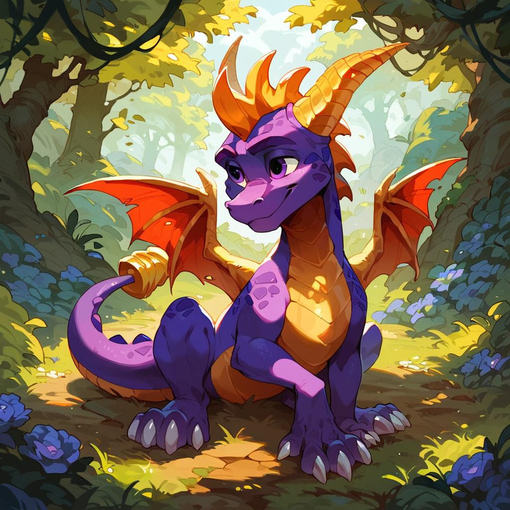 Score_9, score_8_up, score_7_up, score_6_up, rating_safe, spyro the dragon, by xnirox, full body, cute, high quality, detailed, sunlight, forest, outstanding, flat colors, detailed soft lighting