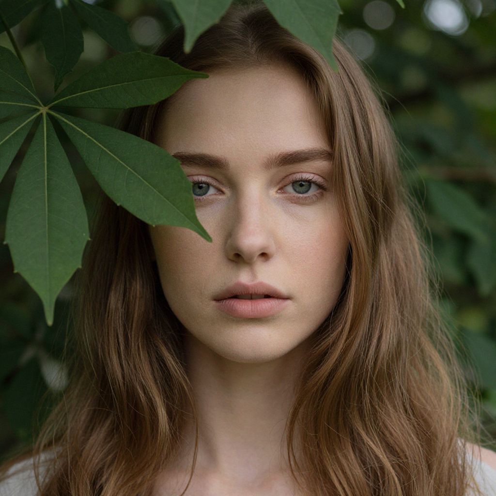 A woman with long hair and leaves surrounding her face, evoking a sense of nature and tranquility.