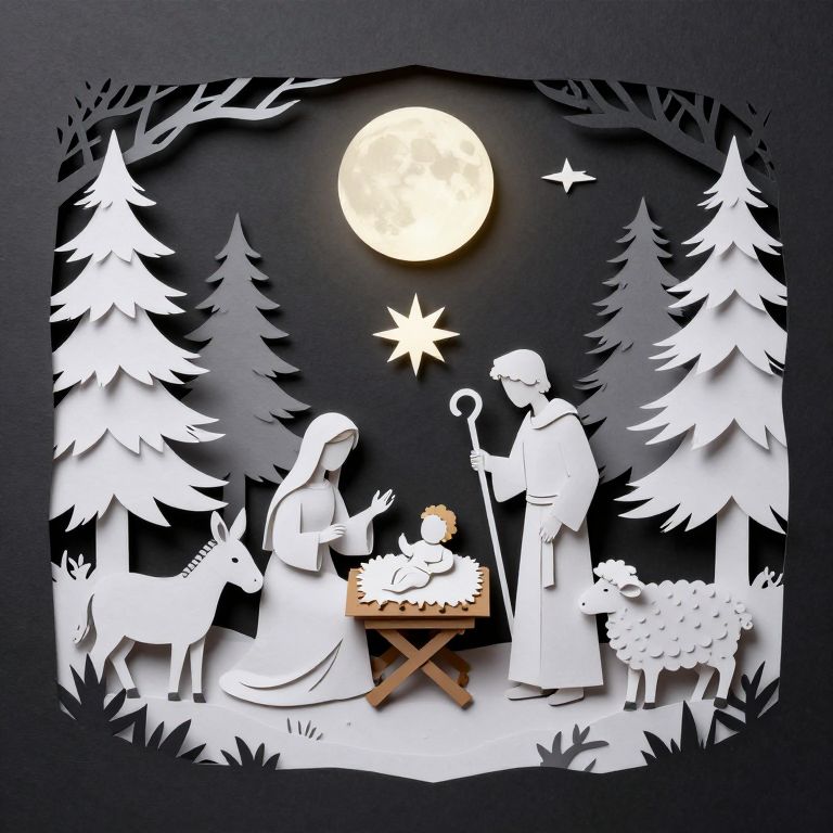 The image is a beautifully crafted paper cut illustration depicting the nativity scene. The scene is set in a serene, snowy landscape with tall evergreen trees framing the top and sides. A bright, full moon shines above, casting a soft glow on the scene. The central focus is the manger, where the Holy Family is gathered. Mary, dressed in a long, flowing robe, sits on the left, holding a small object, while Joseph, in a simpler robe, stands to her right, holding a staff. A baby, likely representing Jesus, is nestled in the manger. Surrounding the manger are various animals, including a donkey and a sheep, adding to the rustic charm. Above the manger, a radiant star shines, symbolizing the Star of Bethlehem. The overall composition is harmonious, with the figures and animals arranged in a balanced manner, creating a sense of unity and tranquility. The use of white paper for the figures and trees against a darker background enhances the contrast and highlights the intricate details of the paper cut art.