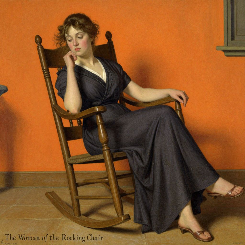 A photograph features a fair-skinned woman with short, curly brown hair sitting in a wooden rocking chair against an orange wall. She wears a dark blue, knee-length dress with short sleeves and brown sandals. Her right elbow rests on the chair's armrest, and her right hand touches her chin thoughtfully. Her left arm rests on the chair's seat. The floor is tiled in a beige color. The image has a vintage feel, with text "The Woman of the Rocking Chair" in the bottom left corner. A small window is visible on the right side of the orange wall.