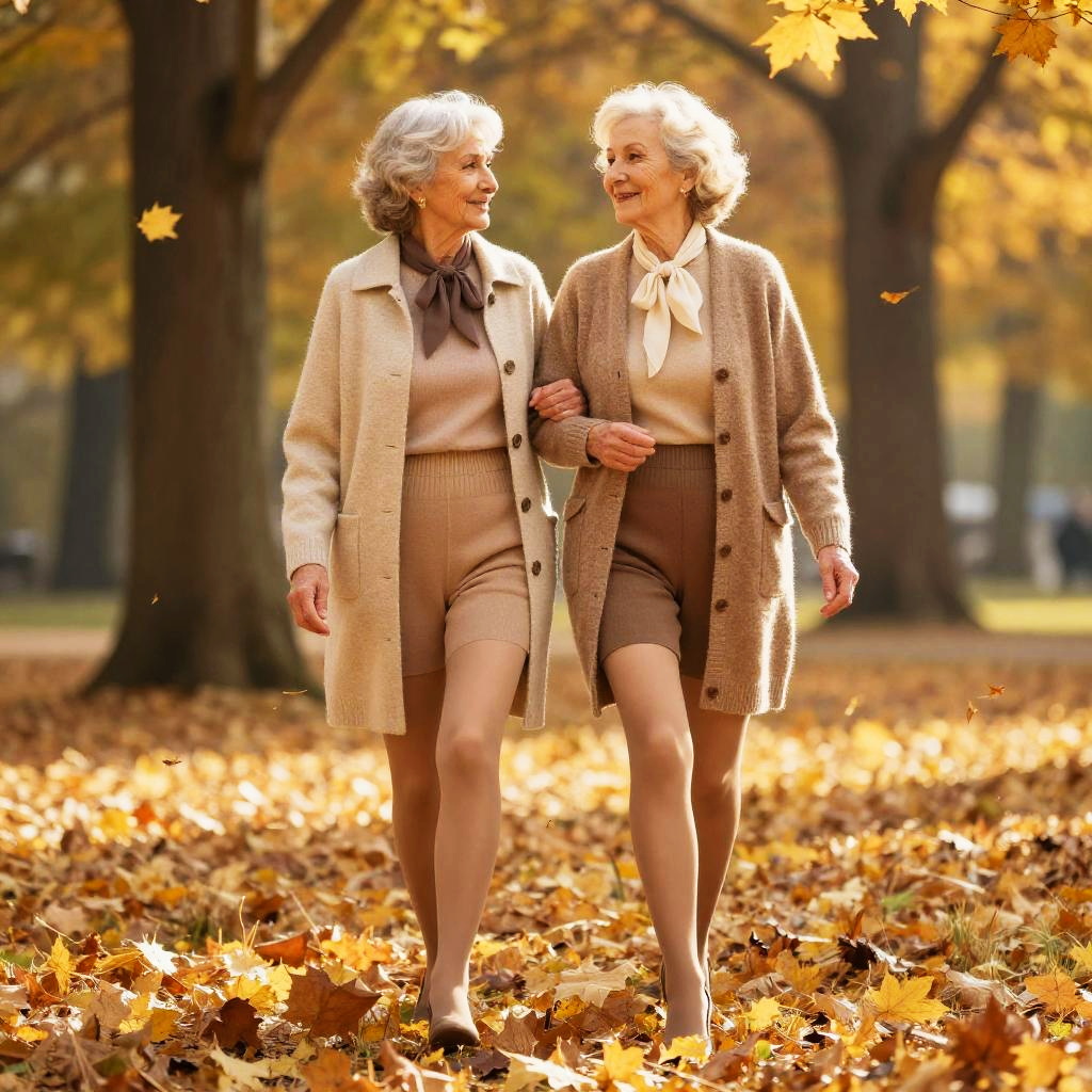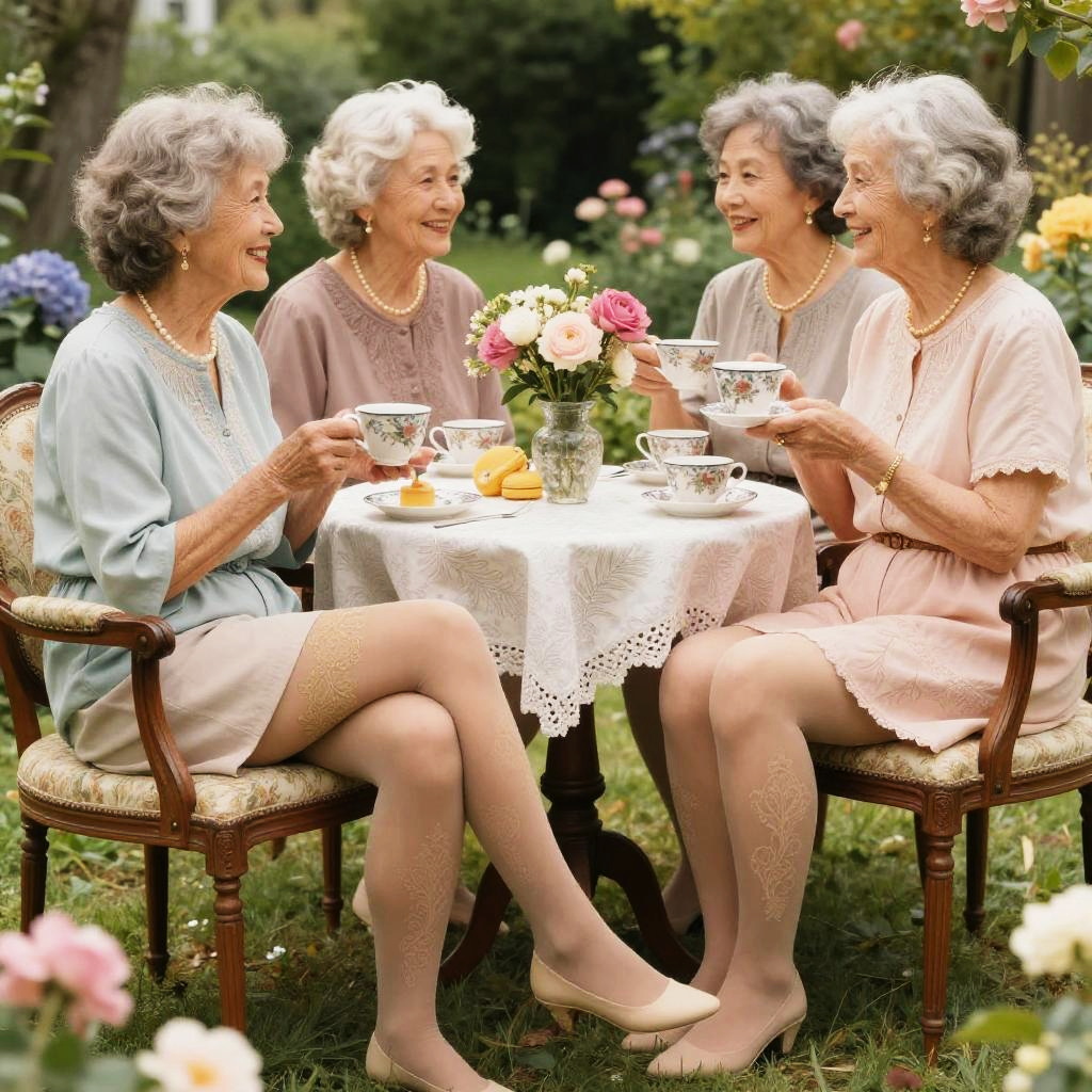 Old women in pantyhose enjoying a garden tea party, surrounded by blooming flowers and antique furniture, soft pastel colors and intricate pantyhose textures