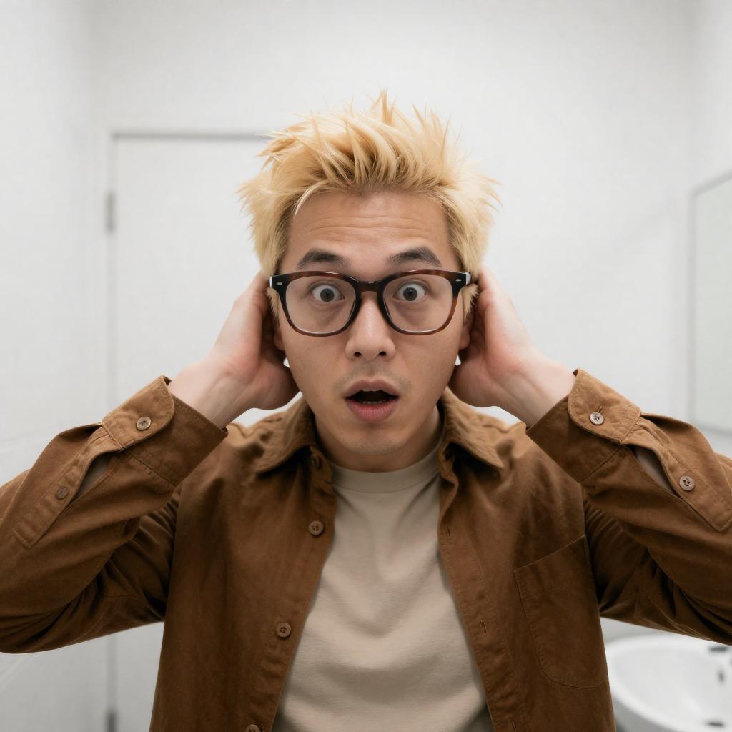 Young man with wild curly hair and round glasses, wearing a red striped shirt and beige cardigan, holding two blue neon glow sticks horizontally. The blue light from the glow sticks illuminates his face inside a room with a wooden door and shelves in the background.