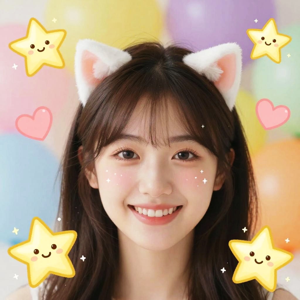 A cheerful girl wearing a cat ear filter with sparkling effects, surrounded by floating cartoon stars and hearts, colorful and dreamy background with soft bokeh, whimsical fantasy art style, warm tones