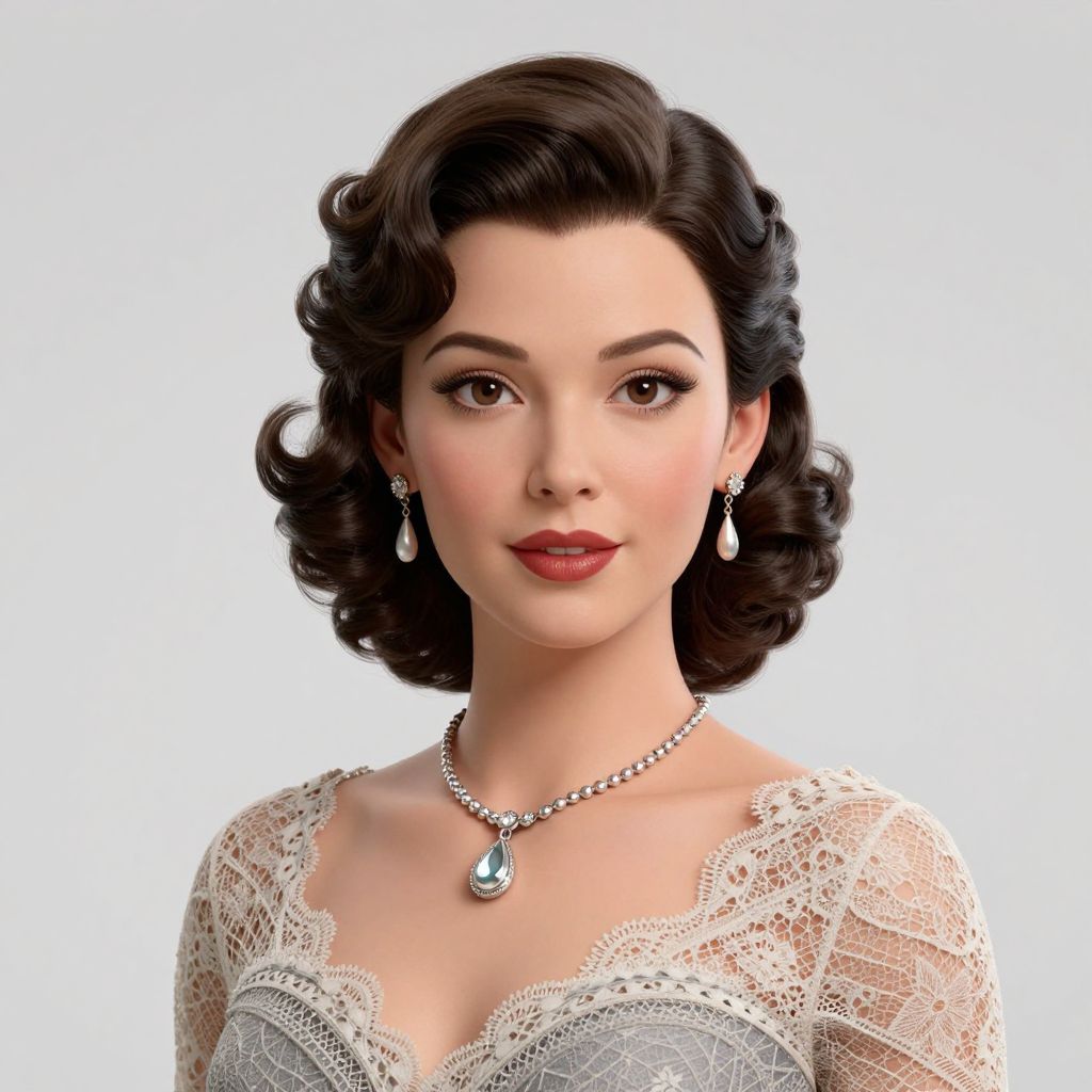 A high-definition 3D-rendered portrait captures a woman with vintage styling, featuring meticulously curled hair, elegant jewelry, and a lace-adorned dress, evoking a classic, retro aesthetic reminiscent of mid-20th-century glamour.