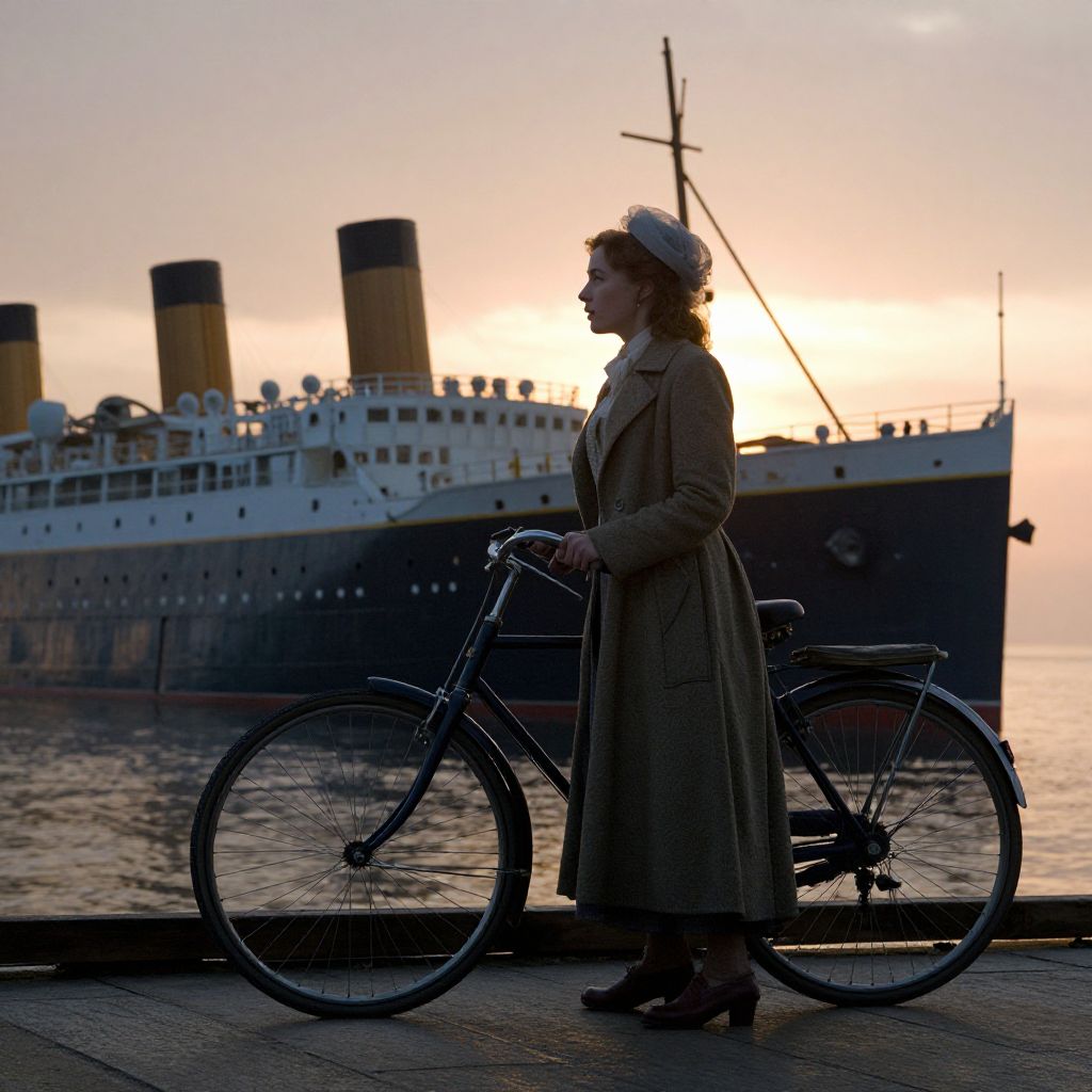 In this striking film still, a woman, played by Saoirse Ronan, stands on a dock at sunrise, silhouetted against the golden hues of the early morning sky. She is dressed in a period costume, with a long coat and a hat, holding a bicycle by her side. The bicycle, with its large wheels and classic design, is positioned in front of her, suggesting she is about to embark on a journey. The dock is lined with railings and a large ship, the HMS Titanic, is visible in the background, adding a sense of historical context and drama to the scene. The overall composition is balanced, with the woman and her bicycle in the foreground, the dock and railings in the middle ground, and the ship and sky in the background, creating a sense of depth and perspective. The interplay of colors, from the warm tones of the sunrise to the cool blues of the ship, enhances the visual richness of the image, while the textures of the woman's coat, the bicycle, and the dock railings add a tactile quality to the scene. The style of the image, with its attention to detail and period accuracy, is reminiscent of the work of Wes Anderson, known for his distinctive visual aesthetic.