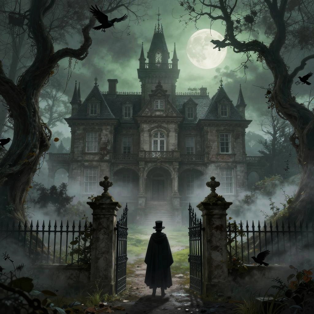 Viktorianisches gothic novel cover style, mysterious fog enveloping an old mansion on a hill, twisted trees and ravens, eerie greenish moonlight casting shadows, a lone figure with a cloak and top hat standing by the gate, atmospheric and suspenseful