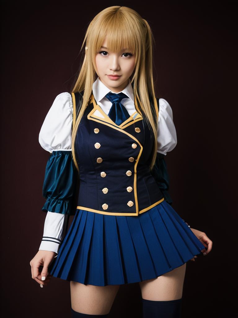 Sexy cosplay woman character wearing Misa Hayase (Lisa) costume. Realistic photo. Jane Doe dressed as Misa Hayase (Lisa) --sref 1404