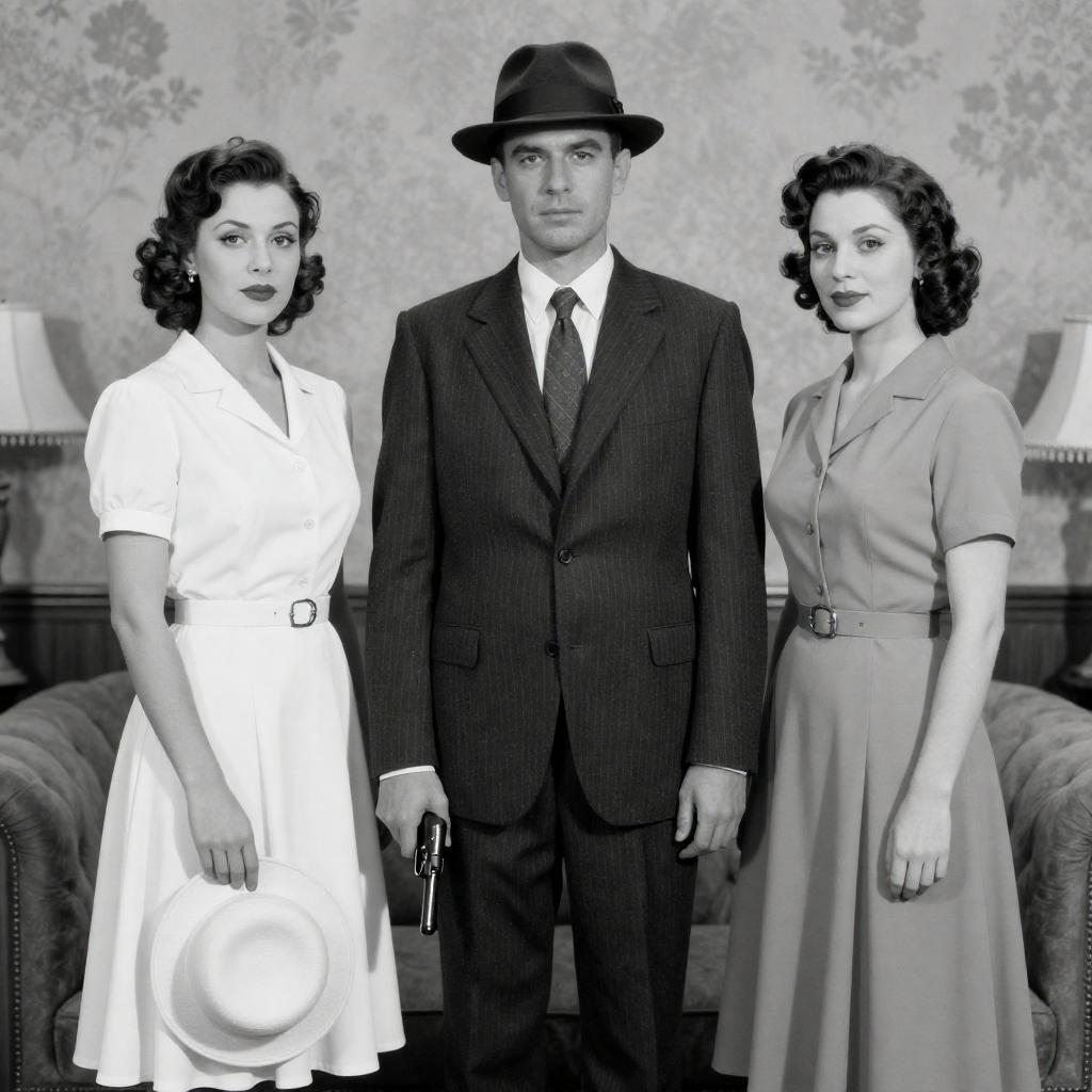 Black-and-white photograph of three people in a vintage setting. A man in a pinstripe suit and fedora stands in the center, holding a gun in his right hand. Two women, one in a white dress holding a hat, stand to his left and right. The background features a tufted sofa and floral wallpaper.