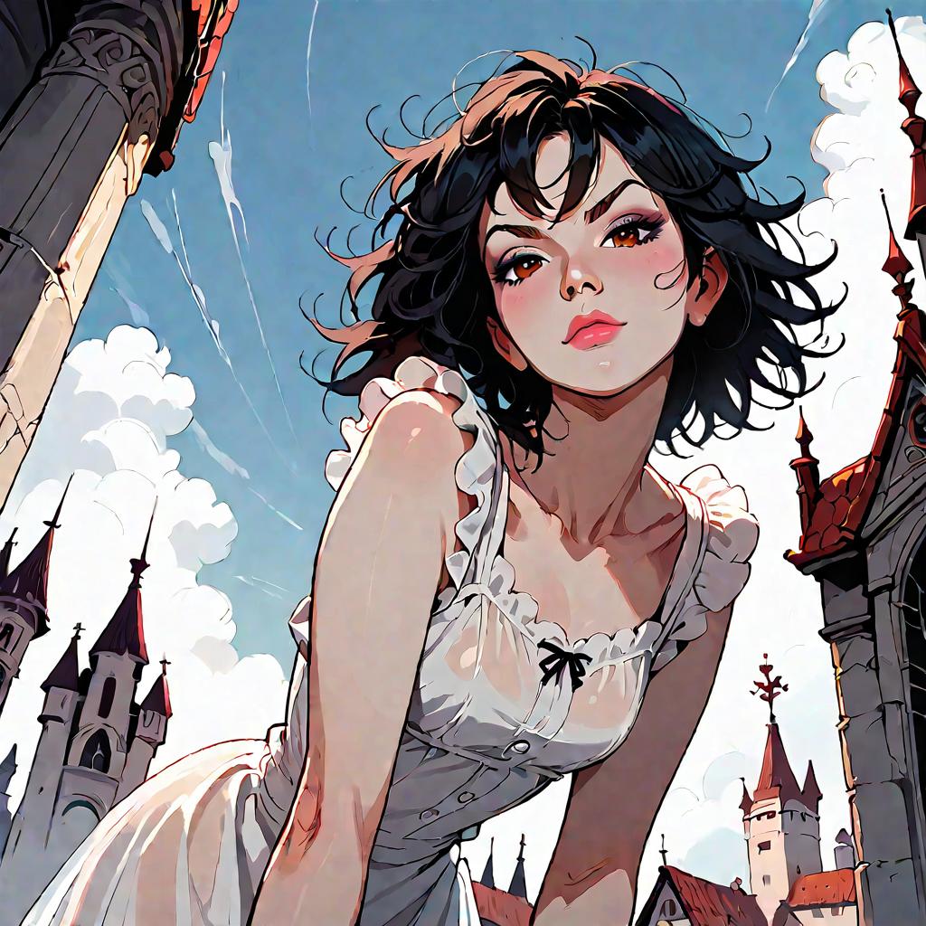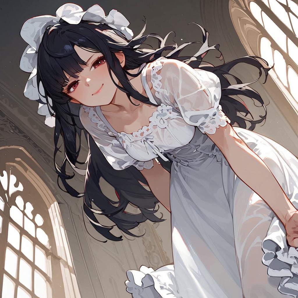 Score_9, source_anime, official art, 1girl, upper body, black hair, long messy hair, red eyes, looking at viewer, from below, scowl, vampire, half-closed eyes, smirk, white see-through sundress, leaning forward, clothes lift, flat breast, barefoot, castle