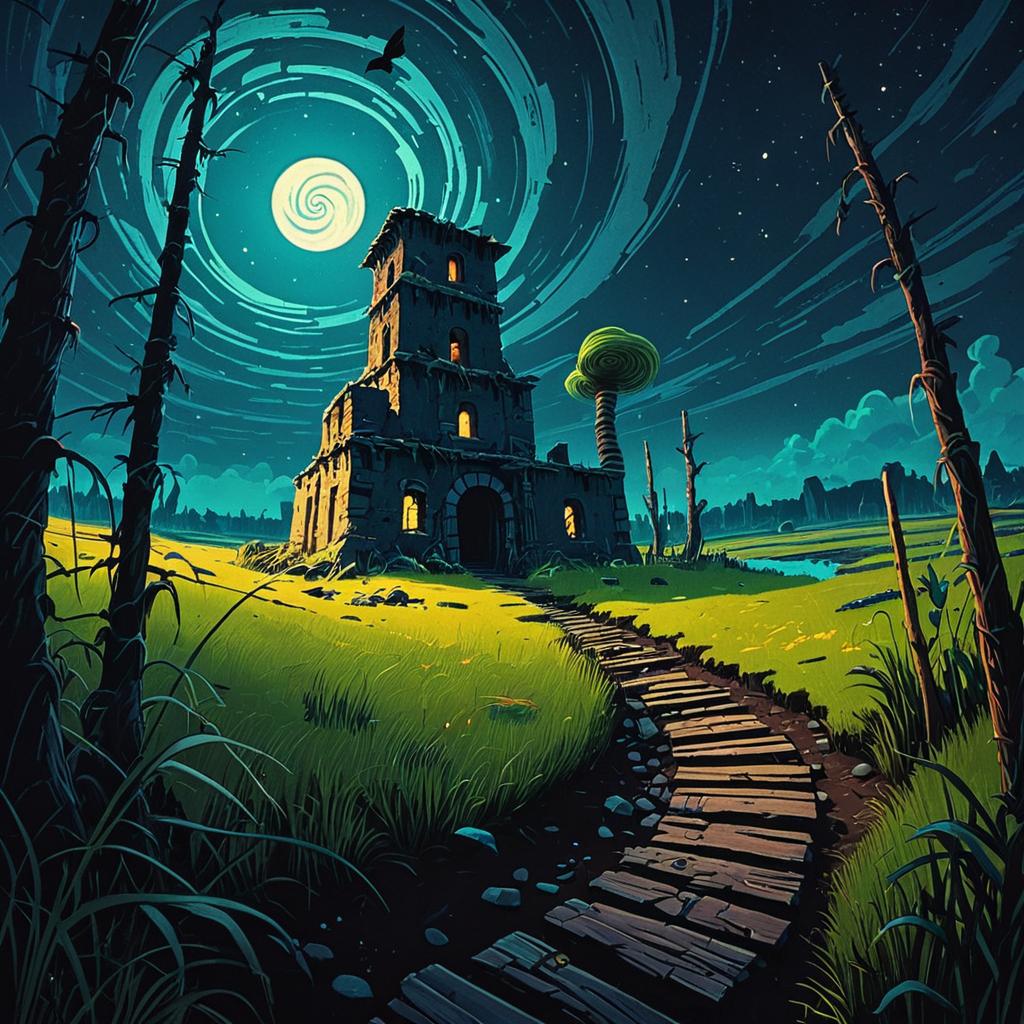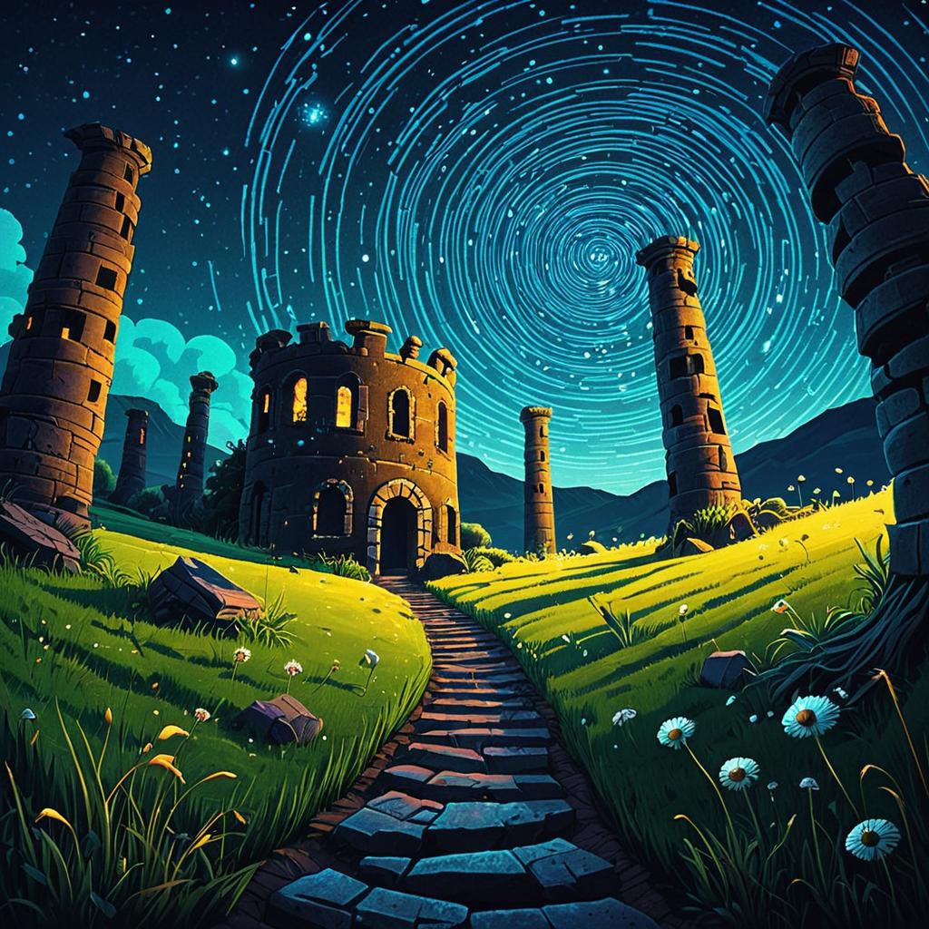 A digitally rendered scene of a grand building with multiple arched windows glowing warmly at night. The building is situated on a hill, framed by lush greenery and tall trees. A wide, winding spiral staircase with railings leads up to the entrance, illuminated by soft lamplight. The night sky above features a striking spiral star pattern, enhancing the dreamy and whimsical atmosphere. The artwork is inspired by naive nerikomi style and the Lorax movie.