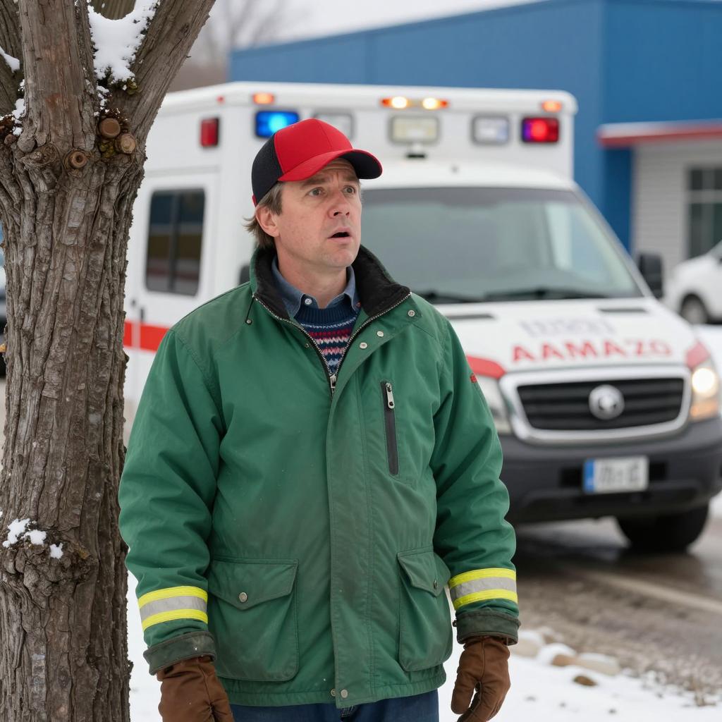 Photograph of a middle-aged man with light skin and brown hair wearing a green jacket, a red and black cap, brown gloves, and a patterned sweater. He stands beside a snow-covered tree looking surprised. An ambulance with red and blue lights is visible in the background, with snow on the ground and a blurred blue building behind.