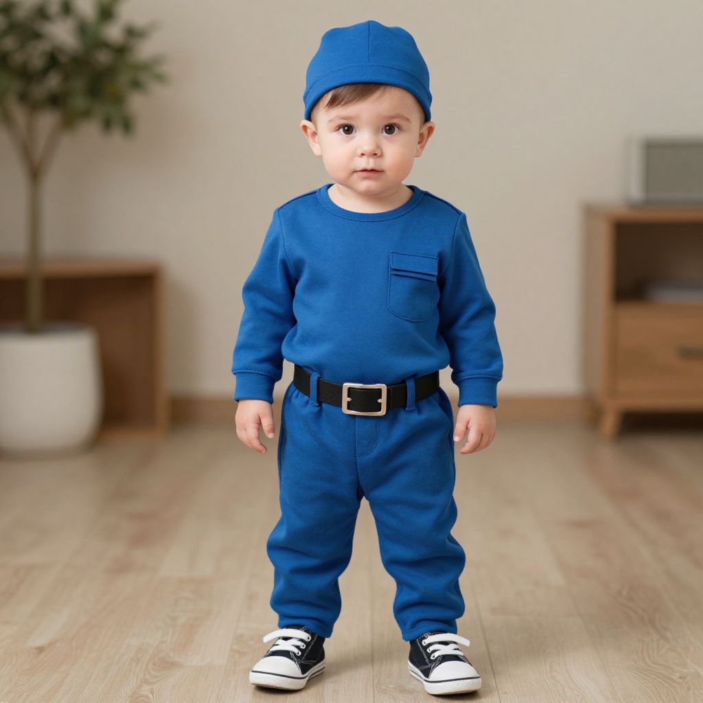 Photograph of a young, light-skinned toddler with dark brown hair, standing in a minimalist room. He wears a bright blue beanie, matching long-sleeve shirt, and pants with a black belt featuring a silver buckle. His shoes are black with white soles and laces. The background includes a wooden floor, a potted plant to the left, and a small wooden shelf to the right. The toddler's expression is neutral, and the room is well-lit with natural light. The overall style is simple and modern.