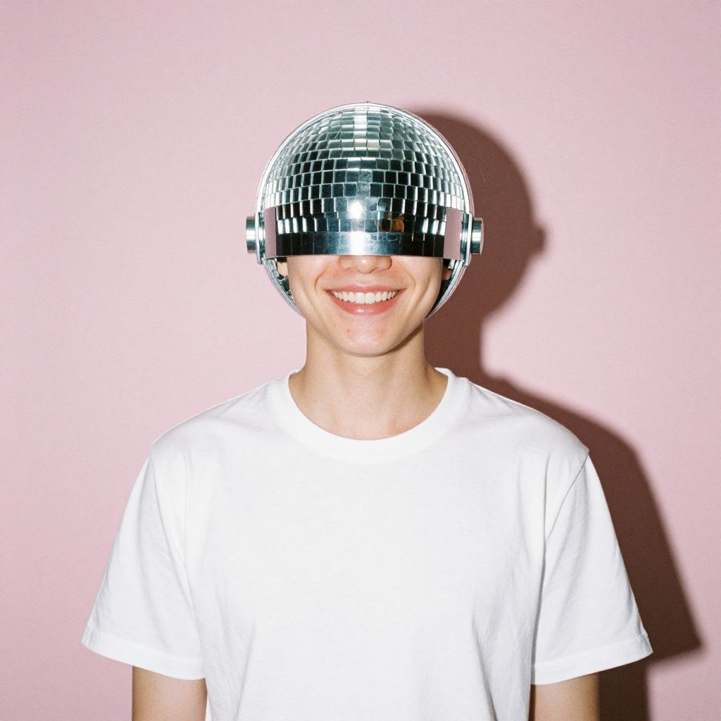 Photograph of a young person with light skin, wearing a white t-shirt and a reflective silver disco ball on their head, which obscures their eyes. They are smiling broadly, showing white teeth. The background is a solid, pastel pink color, with the person's shadow cast to the right. The disco ball's shiny surface creates bright reflections and highlights. The image is brightly lit with high contrast, emphasizing the disco ball and the white t-shirt. The overall style is playful and retro, evoking a sense of fun and nostalgia.