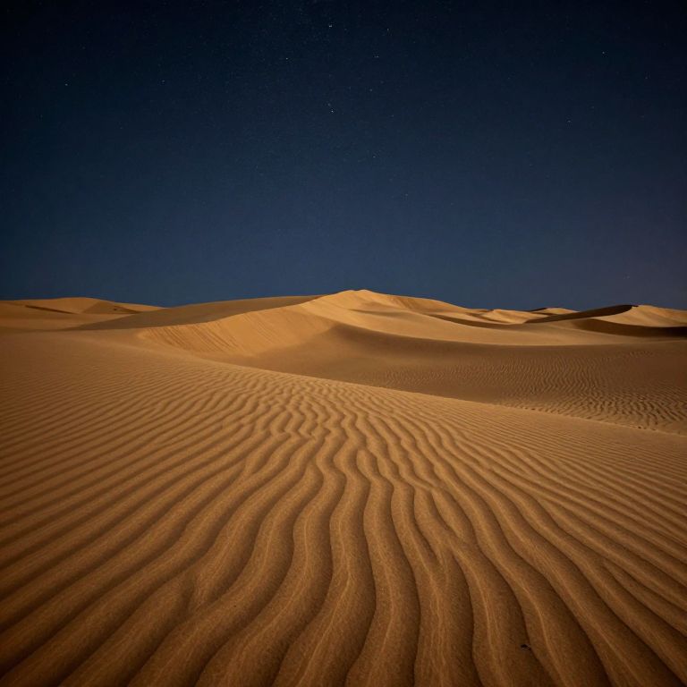 Dunes ripple beneath a starlit sky, their golden sands etched with delicate ridges that reflect the soft glow of distant celestial light, creating a serene contrast against the deep, velvety expanse above.