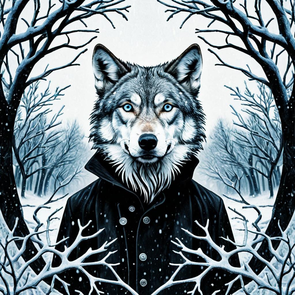 Digital artwork featuring a ghostly wolf with striking blue eyes wearing a black coat, standing amidst frosty, icy winter branches. The background showcases bare trees covered in snow, rendered in a bold and expressive style reminiscent of Edvard Munch, creating a surreal and atmospheric winter scene.