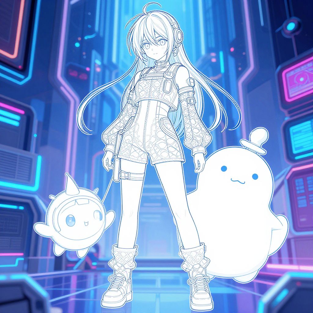 Lace colouring page illustration of anime woman with cute creature sidekick, cyber punk, futuristic, dystopian, outlines only,