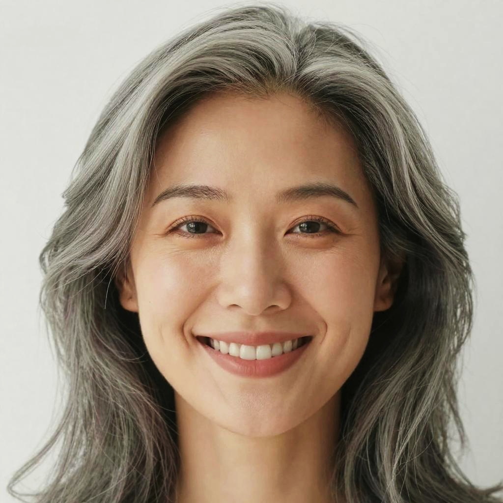 This is a close-up, color photograph of a smiling woman with fair skin and wavy, shoulder-length gray hair. Her eyes are dark, and she has natural makeup with a slight pinkish hue on her lips. The background is a plain, light gray, making her face the focal point. The image has a soft, slightly overexposed look, giving it a gentle, warm feel.
