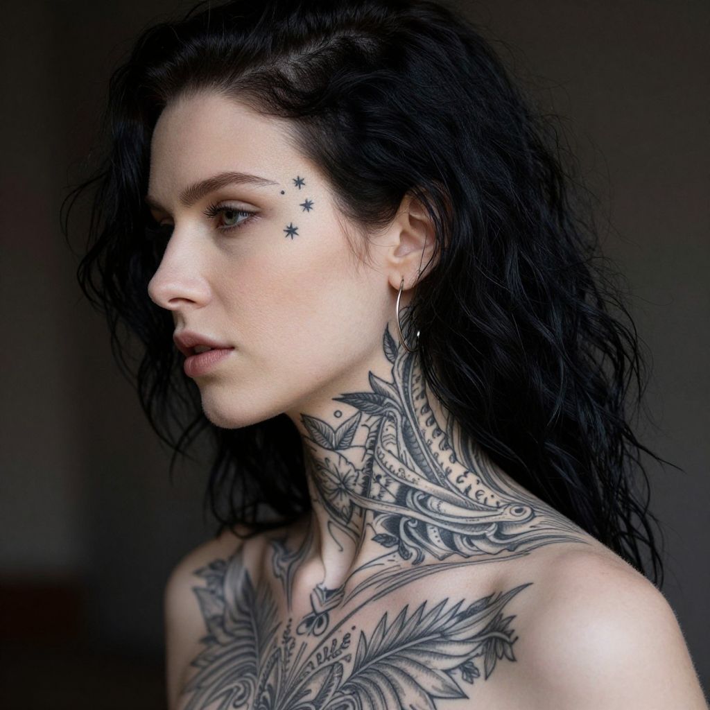 Photograph of a pale-skinned woman with dark, wavy hair. She's facing left, showing off a detailed black tattoo covering her entire neck and upper chest. She has small star tattoos on her cheekbones and is wearing hoop earrings. Her lips are slightly parted, and she has a subtle, confident expression. The background is dark and blurred, making her and her tattoos stand out.
