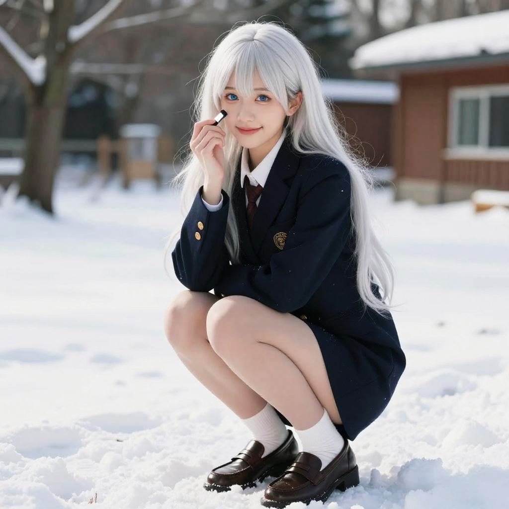 ((masterpiece, best quality)), 1girl, snow, in winter, light smile, medium breasts, landscape, idol, very long hair, blue eyes, white hair, hime_cut, applying makeup, loafers, missionary, realistic,