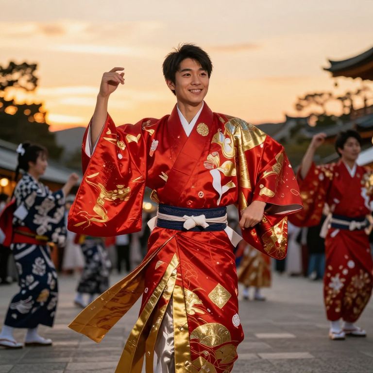Photograph of a smiling Asian man in a vibrant red and gold kimono performing a traditional dance at sunset, with blurred dancers in similar attire in the