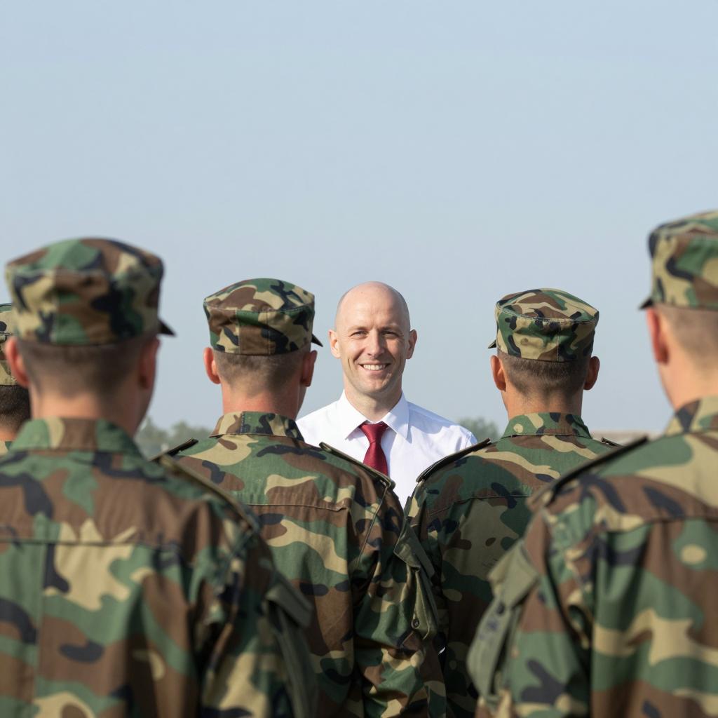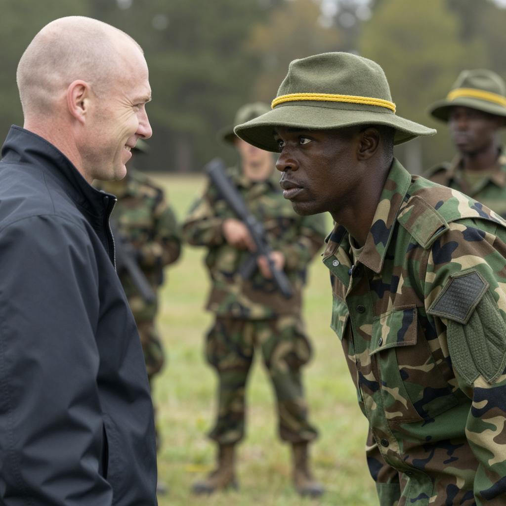 Two soldiers outdoors. Bald white soldier in dark jacket, slight smile, looking at dark-skinned soldier. Dark-skinned soldier in green camouflage jacket, green hat with yellow cord, intense gaze, leaning forward. Two other soldiers blurred in background. Green grass and trees in background.