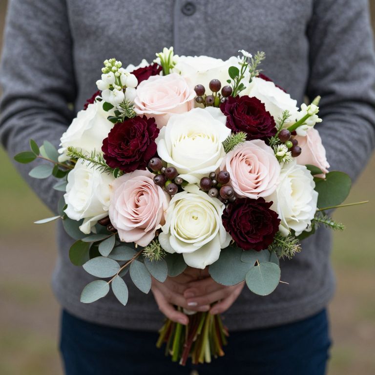 Photograph of a person holding a large bouquet of flowers. The bouquet includes white, pale pink, and dark red roses, interspersed with small greenery and purple berries. The person is wearing a gray, long-sleeved, button-up sweater and dark blue pants. Their hands, with light skin, are visible at the bottom of the bouquet, holding the stems. The background is slightly blurred, showing an outdoor grassy area. The image focuses on the vibrant colors and textures of the flowers, with soft, natural lighting enhancing their freshness.