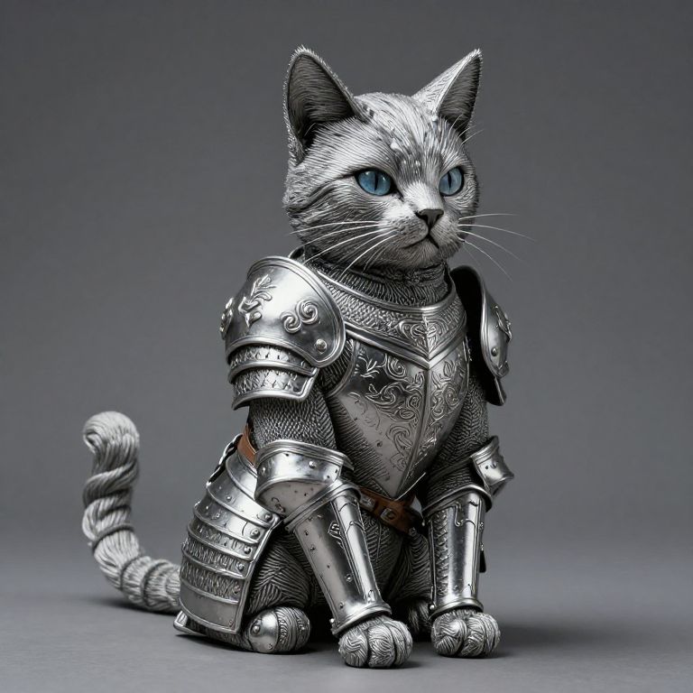 Digital artwork of a silver-armored cat with blue eyes, detailed metal armor, and a curled tail, set against a gray gradient background.