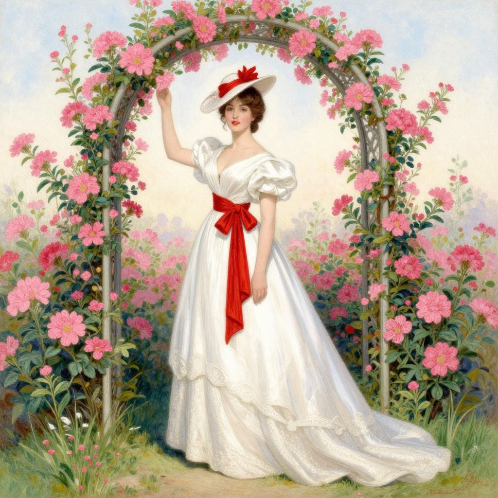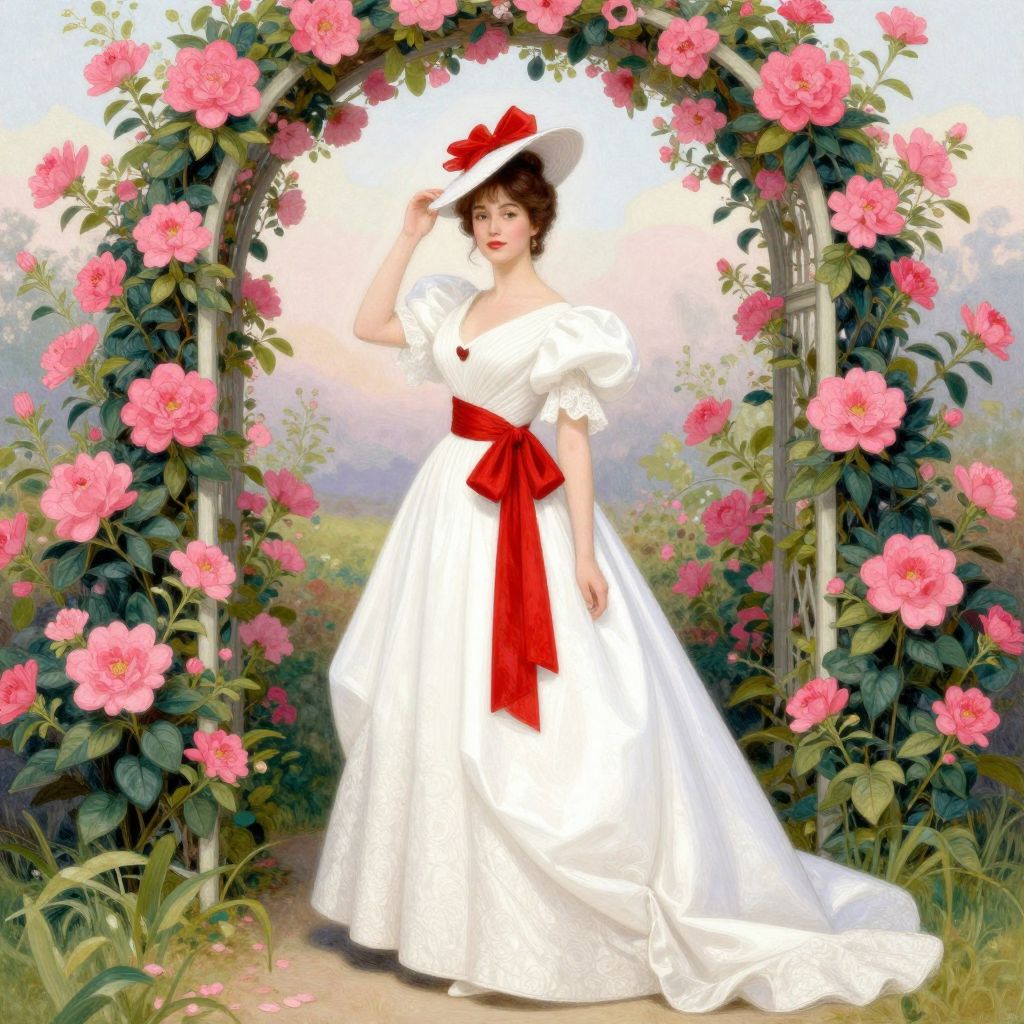 Digital painting of a fair-skinned woman with dark brown hair, wearing a white vintage-style dress with puffed sleeves and a large red bow at the waist. She also wears a wide-brimmed white hat with a red ribbon. She stands in front of a floral archway adorned with pink roses and green leaves. The background features a soft, hazy landscape with greenery and a pastel sky. The dress has a subtle sheen, and the flowers are vividly detailed, adding a romantic, Victorian feel to the scene.