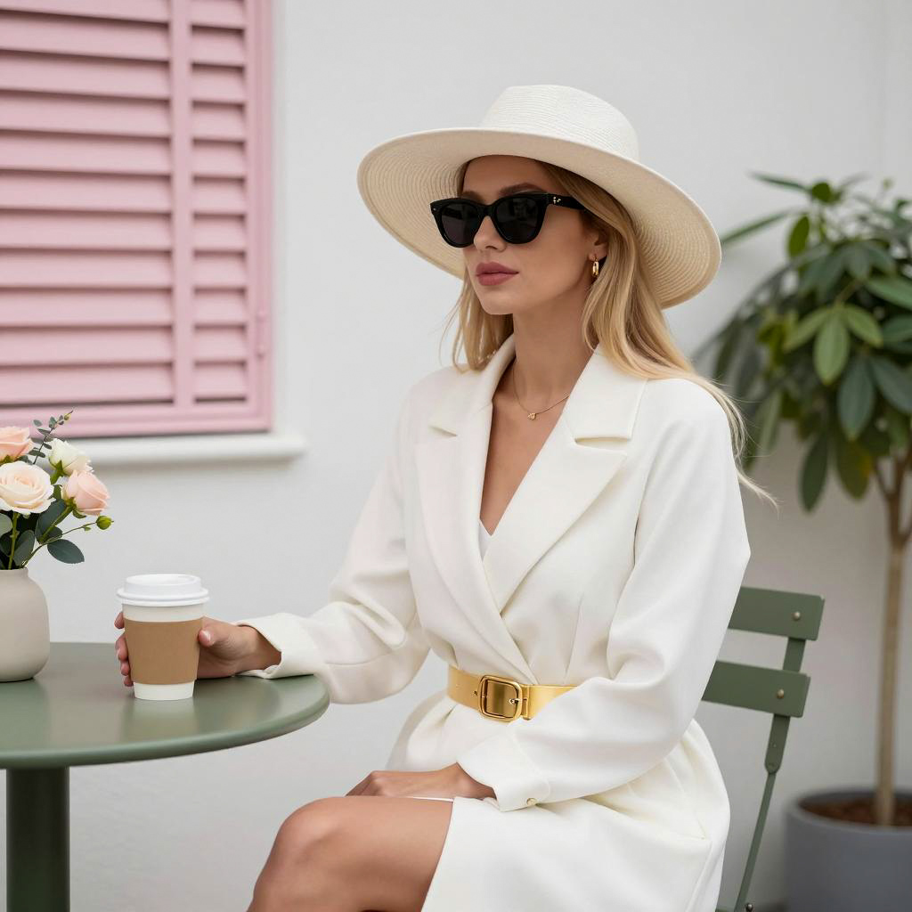 Photograph of a woman with fair skin and red lipstick, wearing black sunglasses, a white double-breasted blazer with gold buttons, and a black-and-white polka dot scarf tied around her head. She has gold earrings and is adjusting her sunglasses with her right hand. She is seated at a table with a white cup of coffee. Background shows a blurred window with reflections of a car and storefront.