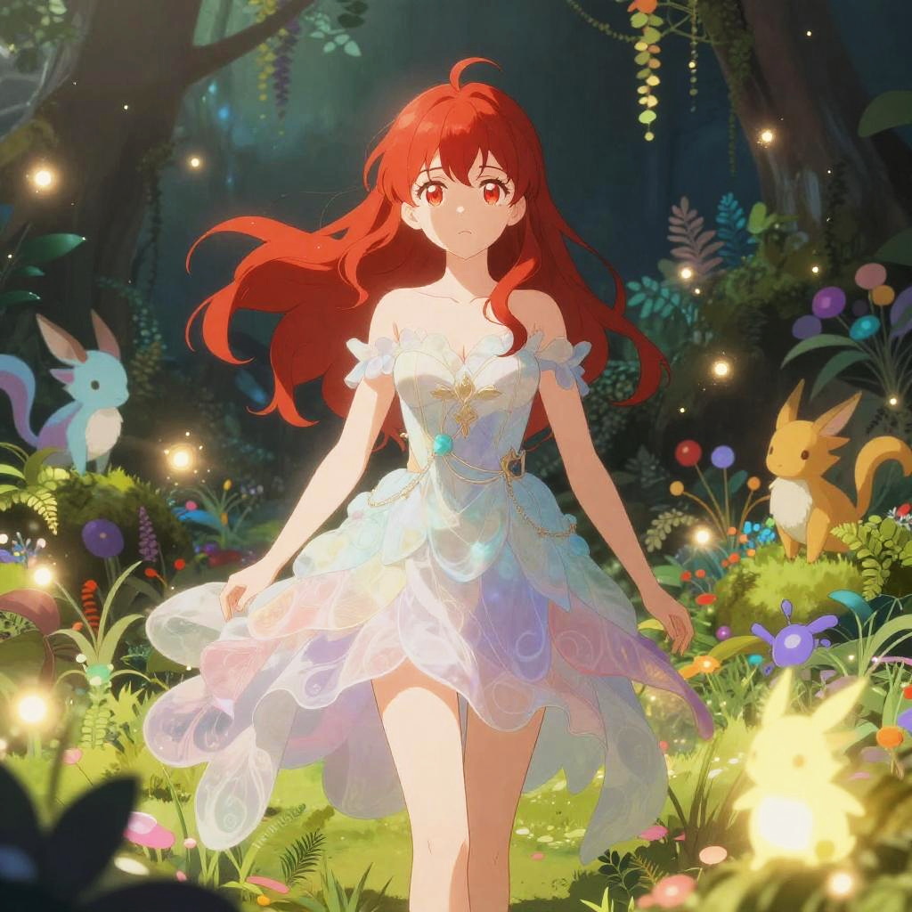 Anime girl red hair red eyes, in a mystical enchanted garden surrounded by glowing plants and enchanted creatures, elegant flowing dress with ethereal textures, soft magical glow enveloping the scene, vibrant and whimsical art style.