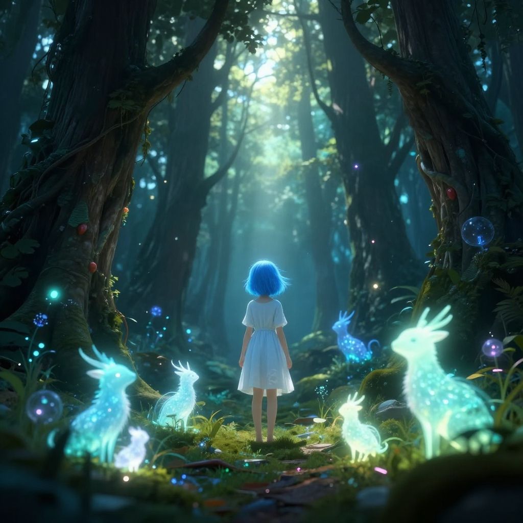 Vibrant digital illustration: Two boys in colorful clothes gaze at a glowing, ethereal figure surrounded by fantastical creatures in a magical forest.