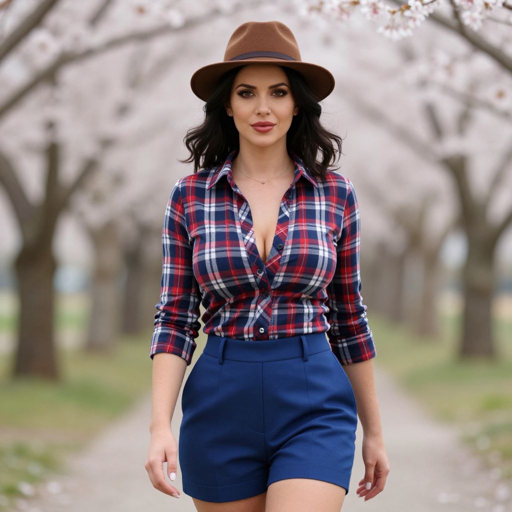 Photograph of a confident woman standing in a park pathway lined with bare trees. She has fair skin, dark wavy hair, and wears a brown fedora. Her outfit includes a red, white, and blue plaid button-up shirt with the top buttons undone, revealing a hint of cleavage, and high-waisted navy blue shorts. She has red lipstick and a subtle necklace. The background is softly blurred, showcasing a path flanked by grassy areas and trees without leaves. The overall style is casual yet stylish, with a focus on the woman's poised and stylish appearance.