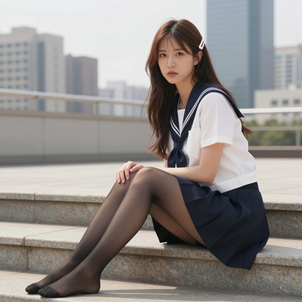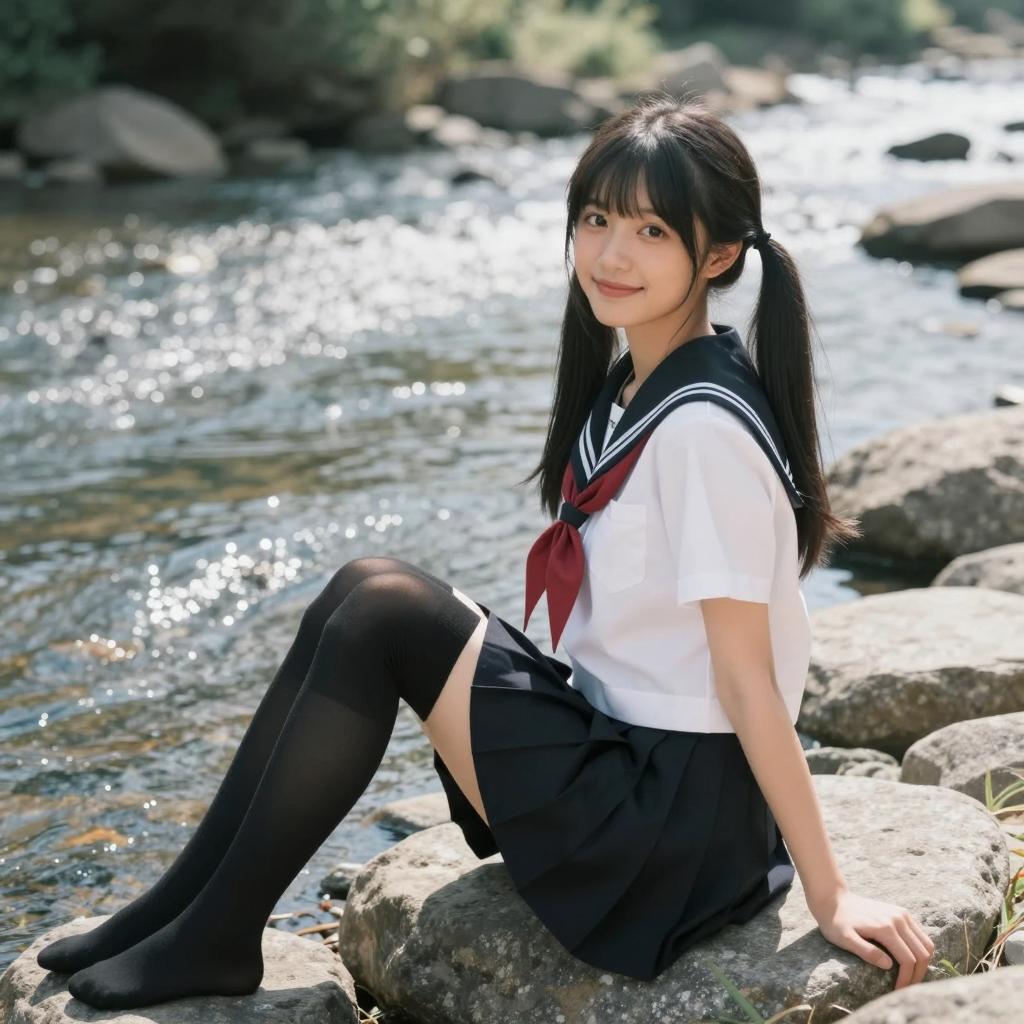 Asian woman with long black hair and bangs, wearing a white sailor school uniform top and black skirt, black thigh-high stockings, sitting on rocks by a river, right leg in water, left leg raised, smiling, green forest background, daylight.