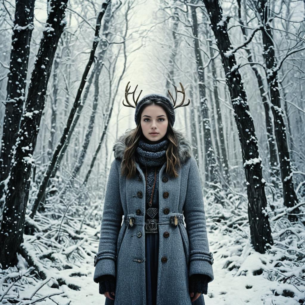 Fantasy young woman in winter forest Christmas setting, style by Alphonse Mucha, 3D, extremely detailed, intricate, beautiful