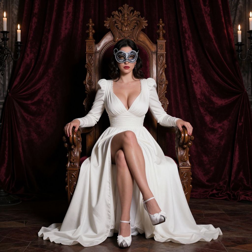 A glamorous woman with soft red lips and golden-brown eyes sits on a vintage wooden throne in a gothic castle ballroom, dressed in a flowing white evening dress with exaggerated heels, her costume part of a Victorian-themed masquerade with dark red velvet drapes and candlelit shadows.. The woman has big tits and cute face