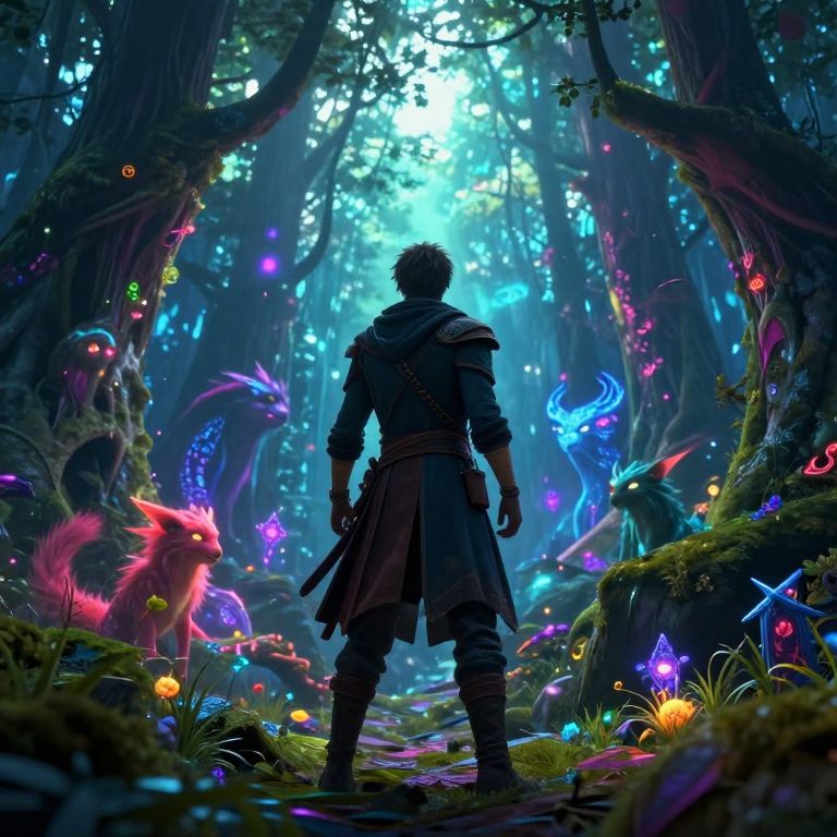 Vallo exploring a dense enchanted forest filled with bioluminescent plants and magical creatures, wearing intricate ancient armor, soft glowing lights, vibrant colors, fantasy adventure theme, highly detailed, immersive environment.