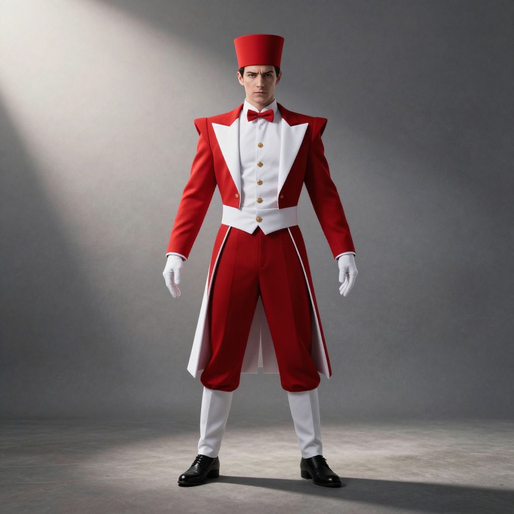 Rectangular Prism magician, red & white costume, full view cinimatic ,dramatic light, relaistic, 8k,