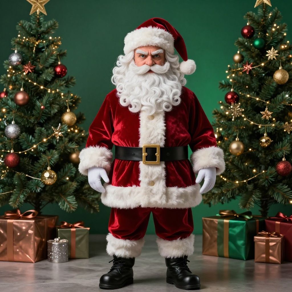 (full body view of (Middle Eastern) santa claus), (wearing Christmas themed outfit and accessories, intense stare), best quality, 8k, hyper detailed, ultra high res, photorealistic, high resolution, detailed raw photo, Christmas theme, holiday photo, Crimson, Burgundy, Ruby Red, Hunter Green, Emerald Green, Pine Green, Forest Green, Christmas Green, siver, gold, bronze, copper, rose gold, masterpiece