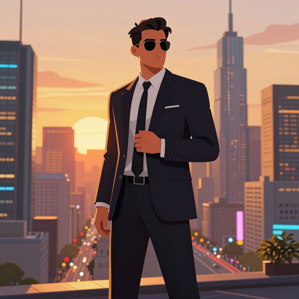 Digital illustration of a handsome man with short black hair, wearing a black tuxedo and bow tie, against a nighttime cityscape with glowing skyscrap